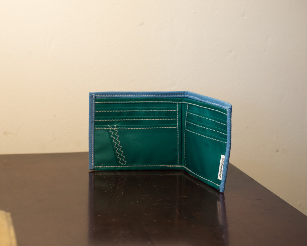 Billfold wallet with Sky Sunbrella Backing and Forest Green Sailcloth